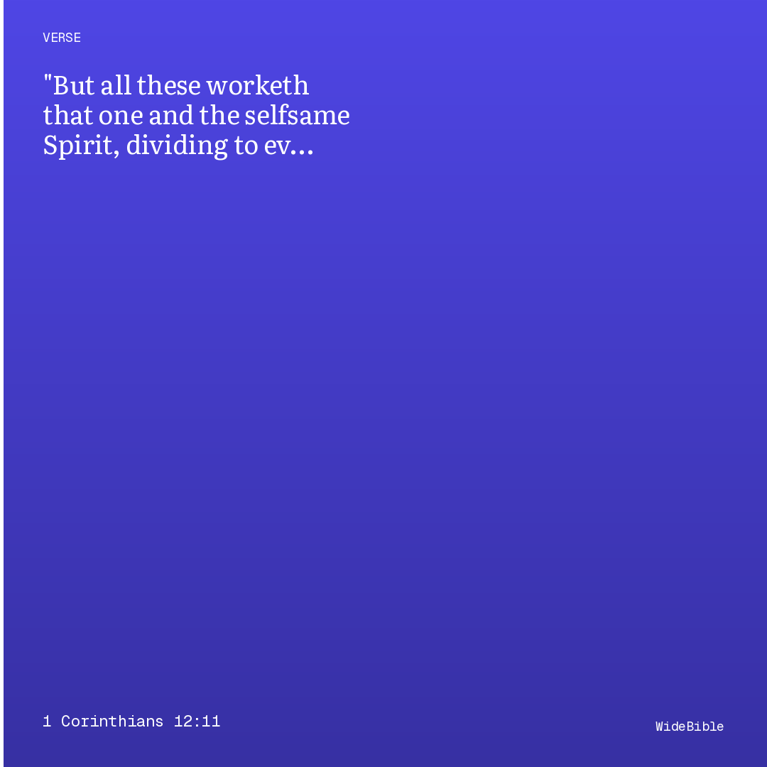 The declaration that spiritual gifts are distributed by 'that one and the selfsame Spirit, dividing to every man severally as he will' establishes divine sovereignty rather than human strategy as the governing principle of charismatic distribution. The verse concludes a section (verses 4-11) that three times asserts unity of source (one Spirit, one Lord, one God) behind the diversity of gifts — a Trinitarian grammar of charismata that grounds ecclesial diversity in the divine life itself. The phrase 'as he will' (kathos bouletai) attributes personal will to the Spirit, supporting the full personhood of the Spirit against any tendency to treat him as an impersonal force. Romans 12:6 ('having then gifts differing according to the grace that is given to us') and 1 Peter 4:10 ('as every man hath received the gift, even so minister the same one to another') develop the same diversity-in-unity theology.
