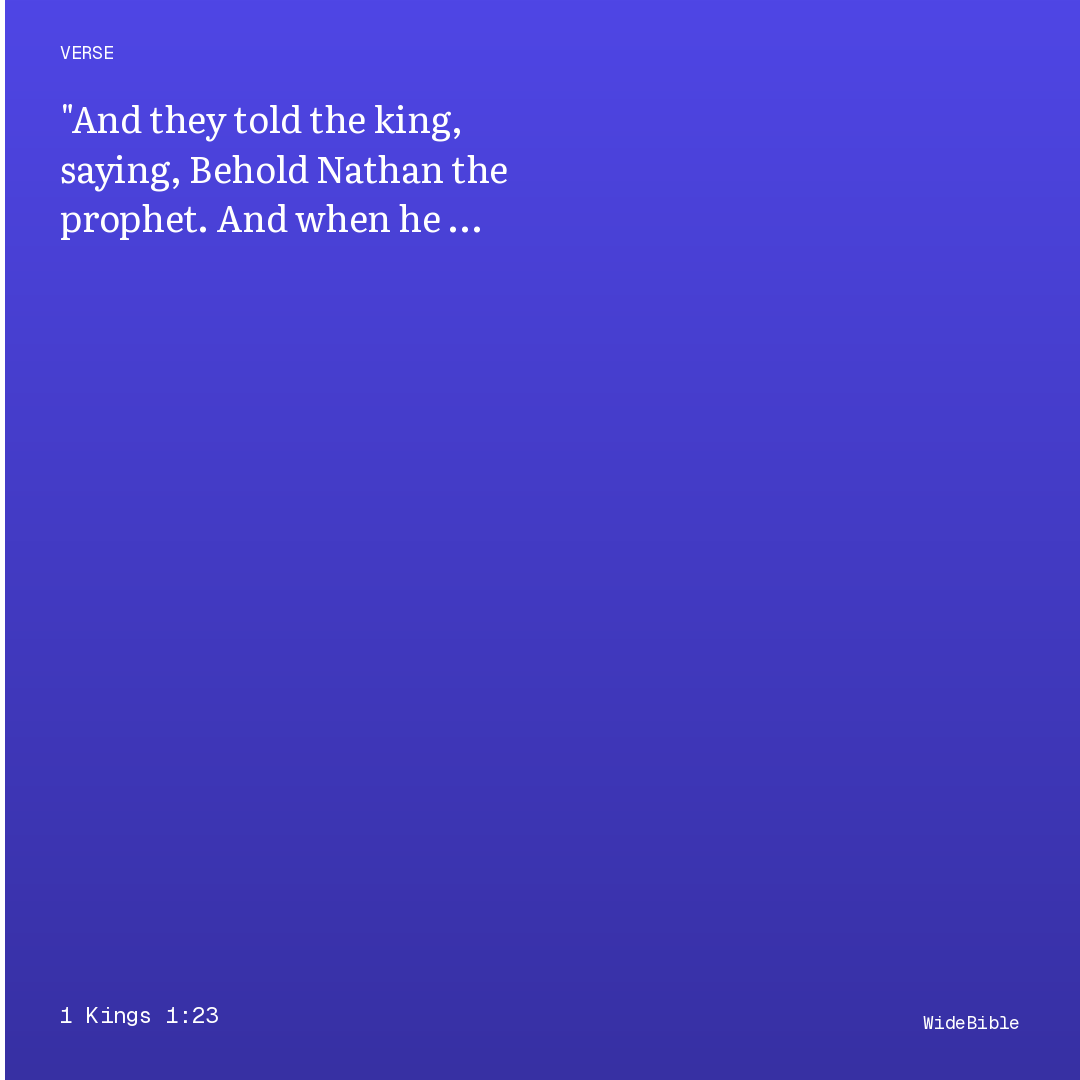 This verse from 1 Kings Chapter 1 connects to 3 cross-references. The aged David is unresponsive to warmth; Abishag the Shunammite is brought to care for him. Adonijah, David's eldest surviving son, moves to crown himself king with the support of Joab and Abiathar; Nathan and Bathsheba inform David, who instructs …