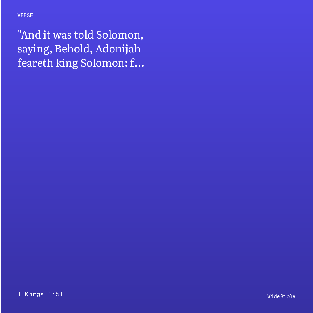 And it was told Solomon, saying, Behold, Adonijah feareth king Solomon: for, lo, he hath caught hold on the horns of the altar, saying, Let king Solomon swear unto me to day that he will not slay his servant with the sword.