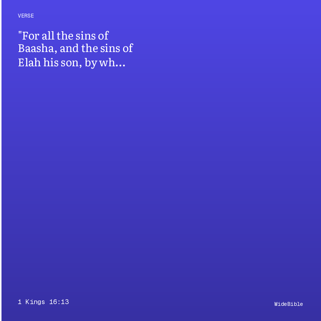 This verse from 1 Kings Chapter 16 connects to 10 cross-references. Baasha's dynasty is condemned by the prophet Jehu; Baasha's son Elah is assassinated by Zimri, who kills all of Baasha's family. Zimri reigns only seven days before Omri's troops besiege Tirzah; Zimri burns the palace over himself. Omri defeats a …