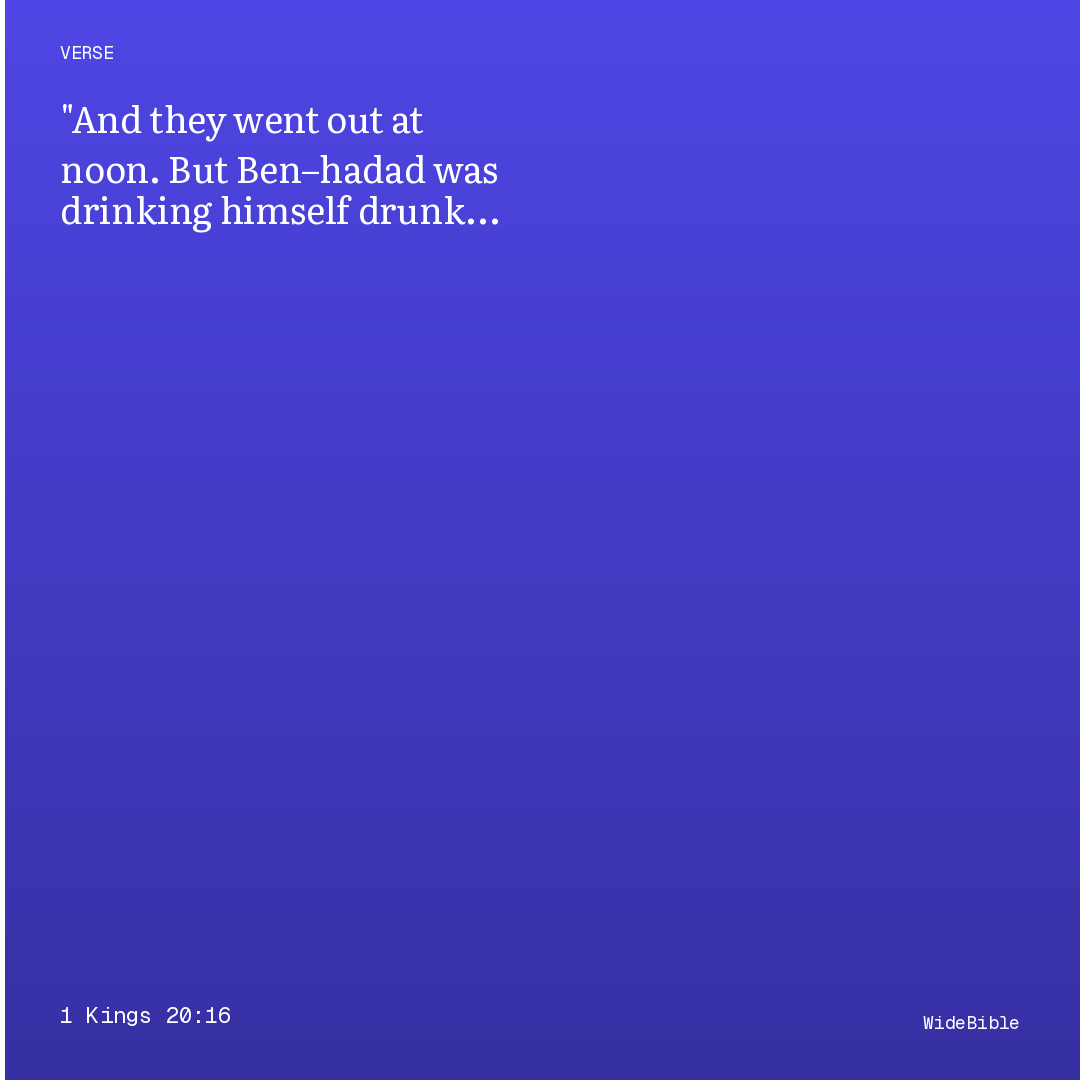 And they went out at noon. But Ben–hadad was drinking himself drunk in the pavilions, he and the kings, the thirty and two kings that helped him.
