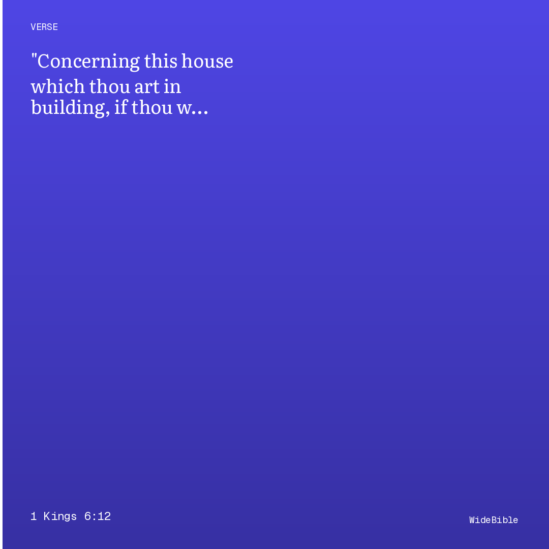This verse from 1 Kings Chapter 6 connects to 10 cross-references. Construction of the temple begins 480 years after the exodus; the interior dimensions and the inner sanctuary (Holy of Holies) are specified. God speaks to Solomon promising to dwell among Israel if they keep his statutes. The interior is lined …