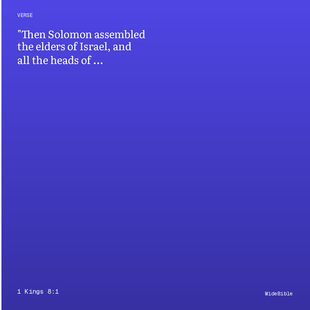 This verse from 1 Kings Chapter 8 connects to 10 cross-references. The ark is brought to the temple and the cloud of God's glory fills it; Solomon's dedicatory prayer rehearses God's covenant with David and asks God to hear prayers offered toward this place from Israelites and foreigners alike, in times …