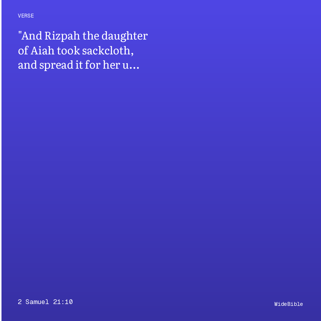 And Rizpah daughter of Aiah taketh the sackcloth, and stretcheth it out for herself on the rock, from the commencement of harvest till water hath been poured out upon them from the heavens, and hath not suffered a fowl of the heavens to rest upon them by day, or the beast of the field by night.