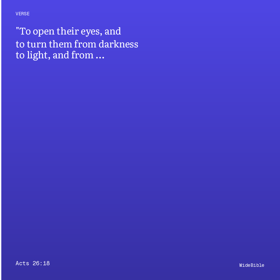Paul recounts Christ's commission on the Damascus road: 'to open their eyes, and to turn them from darkness to light, and from the power of Satan unto God, that they may receive forgiveness of sins, and inheritance among them which are sanctified by faith.' The verse offers one of the New Testament's most comprehensive mission statements, linking illumination (darkness to light), liberation (Satan to God), forgiveness, and inheritance in a single string. Isaiah 42:7's Servant mission — 'to open blind eyes, to bring out the prisoners from the prison' — is unmistakably echoed, connecting Paul's apostleship to the Servant's liberating vocation.