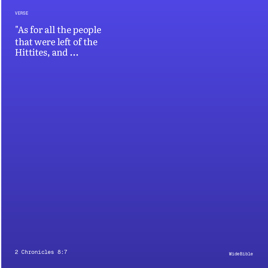 This verse from 2 Chronicles Chapter 8 connects to 5 cross-references. Solomon's twenty-year building program includes towns Hiram gave him and new construction. He conscripts the remaining non-Israelite peoples as forced labor but does not enslave Israelites. He regularizes the temple worship according to Moses' instructions and David's musical appointments; he …