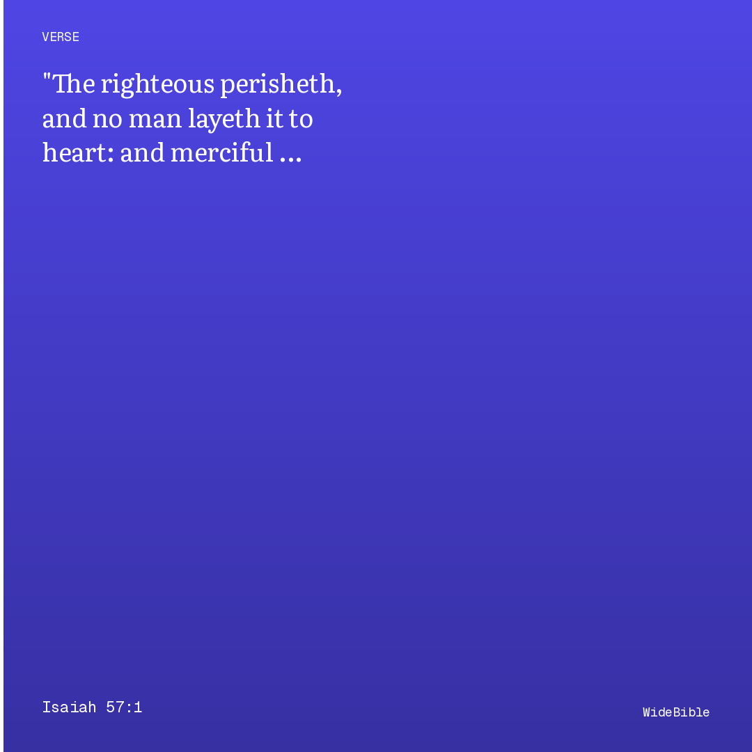 The observation that 'the righteous perisheth and no man layeth it to heart; merciful men are taken away, none considering that the righteous is taken from the evil to come' presents an early form of the theology that premature death of the righteous may be divine protection rather than divine abandonment. The phrase 'taken from the evil to come' (melifnei hara'ah) introduces a providential reading of early death that inverts common wisdom: the community's lack of mourning signals their failure to understand divine care. Wisdom of Solomon 4:10–15 develops this interpretation of premature death as translation from earthly danger, and it appears in Christian martyrology traditions where death before apostasy is presented as divine mercy. The verse has been used in Christian preaching to offer comfort at unexpected deaths and to challenge simple equations of long life with divine favor.