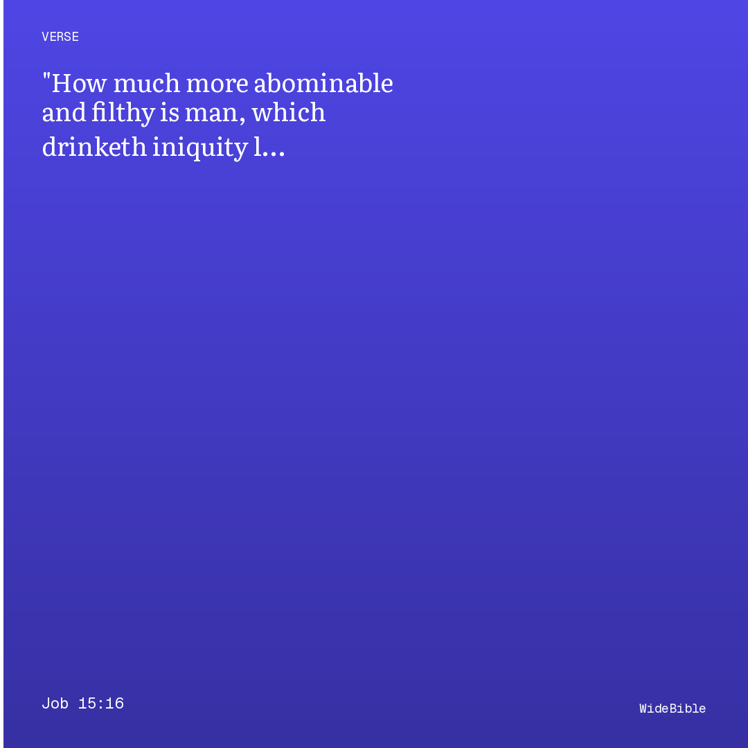'How much more abominable and filthy is man, which drinketh iniquity like water' — Eliphaz's second speech deploys rhetorical hyperbole to reinforce his doctrine of universal human corruption as the explanation for Job's suffering. The 'drinking iniquity like water' metaphor suggests compulsive, natural, and insatiable appetite for sin — an image later echoed in Proverbs 26:6 and reversed positively in Amos 5:24 ('let justice roll down like waters'). While Eliphaz's dogmatic retributionism is ultimately condemned by God in Job 42:7, this specific observation about human corruption finds resonance in the broader biblical anthropology of Psalm 51:5 and Romans 3:23.