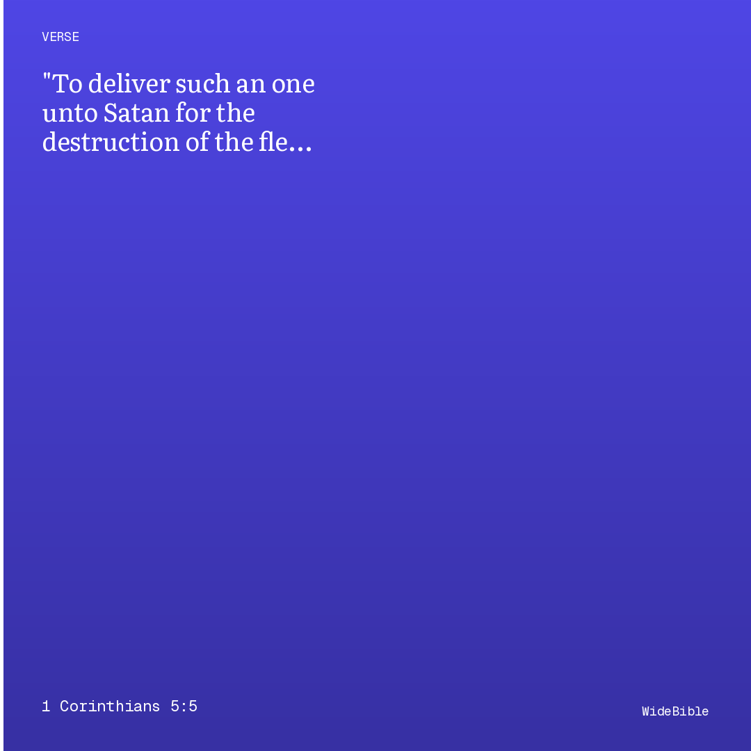 'To deliver such an one unto Satan for the destruction of the flesh, that the spirit may be saved in the day of the Lord Jesus' — this startling disciplinary directive about the man living with his father's wife describes exclusion from the community's protective covenant space as a form of remedial judgment. The phrase 'destruction of the flesh' has been interpreted as physical suffering, mortification of sinful passions, or even premature death, but the salvific purpose ('that the spirit may be saved') indicates that the action is medicinal rather than purely punitive. The verse has been central in debates about the nature and goal of church discipline, generally understood to prohibit excommunication-as-abandonment in favor of excommunication-as-healing.