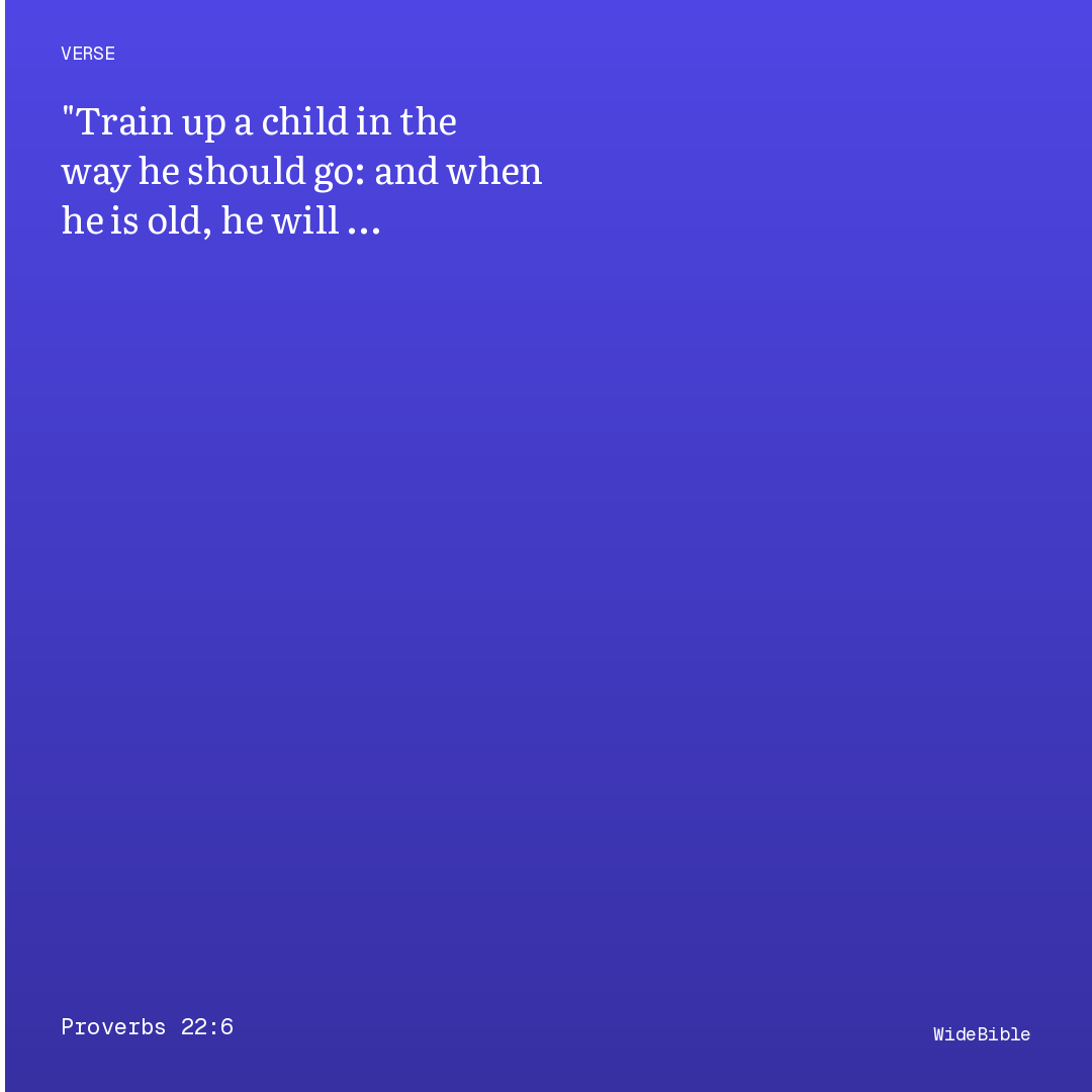 The verse 'train up a child in the way he should go; even when he is old he will not depart from it' has become one of the most cited biblical texts on parenting. The Hebrew 'chanoch' (train/dedicate) is the same root as the name Enoch and the word for Hanukkah (dedication), suggesting a thoroughgoing consecration of a person's direction. Whether 'the way he should go' refers to the child's unique disposition or to God's way of wisdom is debated; the former reading has been influential in child-psychology approaches. The verse is a wisdom observation (like most in Proverbs) describing typical patterns, not an absolute promise immune to exceptions.