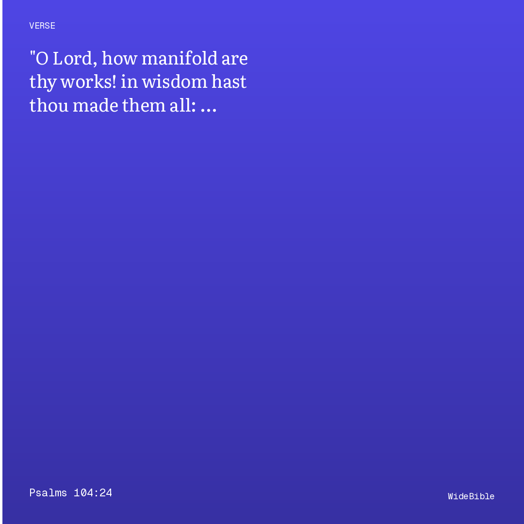 'O Lord, how manifold are thy works! in wisdom hast thou made them all: the earth is full of thy riches' — the great creation psalm reaches its doxological center with a sweeping affirmation of divine wisdom as the organizing principle of creation's complexity. The word 'manifold' (rabbu) and 'wisdom' (chokhmâh) connect this verse to both Proverbs 8:22–31 (Wisdom as the master craftsman beside God at creation) and John 1:1–3 (the Logos through whom all things were made). The 'riches' (kinyanim — acquisitions/possessions) frames creation as God's own property, undergirding the theological principle of Psalm 24:1 that 'the earth is the Lord's and the fullness thereof.'