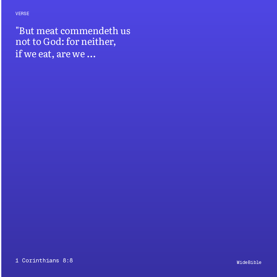 This verse from 1 Corinthians Chapter 8 connects to 5 cross-references. Food offered to idols: knowledge puffs up but love builds up. An idol is nothing — food does not commend us to God. But not everyone has this knowledge. If food causes a brother to stumble, Paul will never eat …