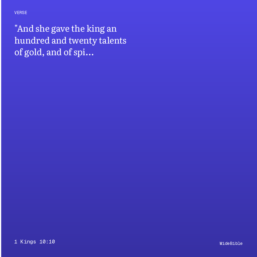 This verse from 1 Kings Chapter 10 connects to 10 cross-references. The queen of Sheba visits Solomon to test his wisdom with hard questions; she is overwhelmed by his wisdom, his palace, his food, his servants, and his temple worship. She presents extraordinary gifts of gold, spices, and precious stones; Solomon …