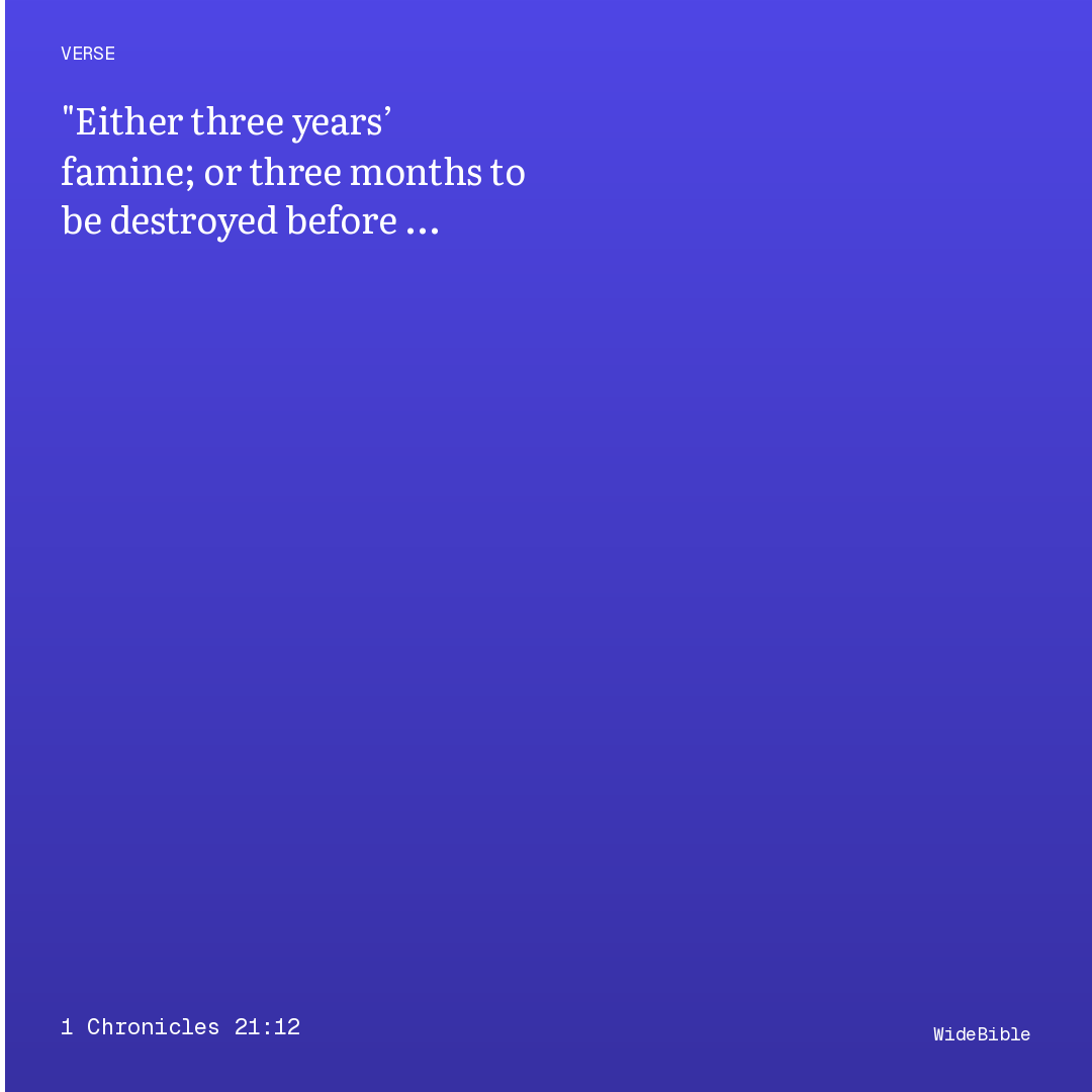 This verse from 1 Chronicles Chapter 21 connects to 10 cross-references. Satan incites David to take a census; Joab reluctantly complies but stops before completing Levi and Benjamin. God gives David a choice of three punishments; David chooses three days of plague rather than human enemies. The angel of God stops …
